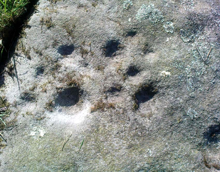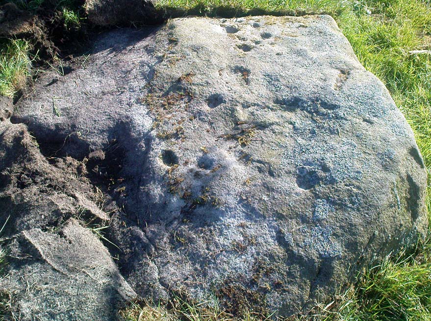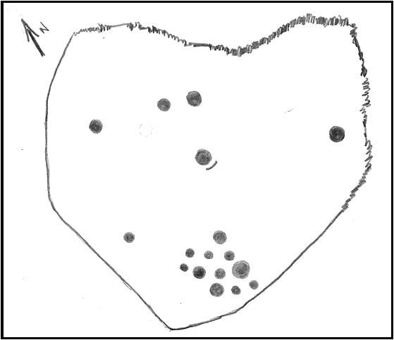 Although no accurate measurements were made of the stone (it was bigger than 10-inch!), at least 17 cup-markings were counted here: one singular and very well-preserved cup, alone on its southern edge, right by the walling. But the main feature of the design is a cluster of cup-marks (at least 11) on the western side of the rock — one part of this cluster having the appearance of the figure 5 on a dice! Several other well-defined cups occur on the central and more northern end of the rock.