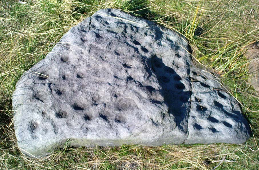 There are between 55 and 61 cup-markings etched onto this stone, with several short lines and ringlets; with one small ridge of two curves ‘arching’ over a couple of cups giving the impression of owl’s eyes! (O.G.S. Crawford would have loved this one in his book, The Eye Goddess!) The stone gave me the distinct impression that it had either once stood upright, or else was part of a burial; and the finding of a prehistoric cairn just a few yards to the west reinforced this thought (although, gotta be said, knowing that cup-&-rings and death is a common theme upon these moors, it’s likely to sometimes afflict my ability to see these carvings with fresh eyes each time I come across them). Added to this is that the carving is in a very good state of preservation, with a considerable lack of general erosion on the cup-marks (as found on the majority of carved rocks on these moors) adding considerably to the thought that this might have once served part of a tomb, or perhaps cist cover and only been brought to the surface in quite recent years. This seems undeniable.
