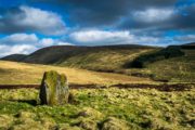 This is alleged to be just one standing stone in a straight line of five once-upright monoliths.  Starting at the southwestern end of this row we have the 7ft-long cup-marked Sheriffmuir Carved stone — which certainly looks as if it stood upright in the not-too-distant past — and as we move up the line we pass another that’s been split in half.  Another earthfast-looking rock is the next contender, before we reach our famous Wallace Stone, standing upright and proud on this moorland ridge.  It’s about 6ft tall and 3ft across at its widest and certainly acts as a marker for the line of stones that allegedly stood upright here.  And if we walk just a bit further up we have another big stone laid on the ground which is alleged to be a part of the same alignment.