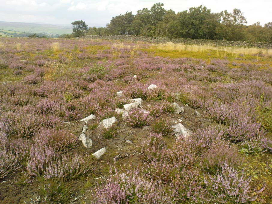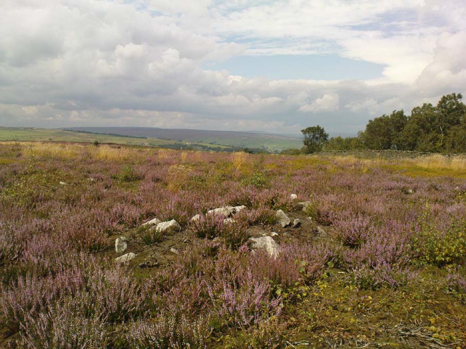 From the road between Pateley Bridge and Summerbridge, the B6165, turn down to Glasshouses, following the road through the village and round past the reservoir; then as the road bends, keep to your left and go the steep zigzaggy hill, stopping where a gravel parking space is on the right-hand side of the road, by the bend. From here, cross the road and walk up the footpath to Yorke’s Folly. Go over the wall and along the footpath by the wall (the Nidderdale Way) for a coupla hundred yards. Then turn into the heather about 50 yards up from the walling. Look around!