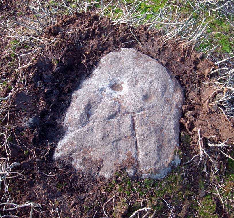 One of this regions many simple cup-marked stones, this example is another that is not in the archaeological records as it was rediscovered on March 1, 2012, by one-time rock art student, Michala Potts of Keighley. Found in association with one of the many prehistoric cairns in the landscape, it is a small flat rock, that was mainly covered over in dead bracken remains. There are two very distinct archetypal cup-marks etched on the westernmost half of the stone, with a possible faint third in-between the two. The larger of the two cups measures 2 inches across and is a half-inch deep; the other cup being 1½ inch across and roughly the same depth. Several other cup-and-ring stones can be found close by.