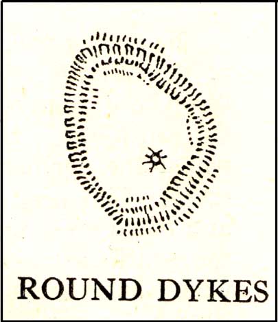 “The Camp—known locally as Round Dykes—is of an irregular oval shape, the longest axis measuring over all 300 feet, and the shorter 250 feet.  The trench outside the vallum is about 15 feet wide, and 4 or 5 feet in depth.  The area is level, showing no indications of buildings or works of any kind.  A feeble spring of water rises at one corner.  The trench is regular and even, and does not appear to have ever been used as a series of pit dwellings.  This work commands a large and splendid view of Wharfedale…”