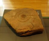 The primary design consists of a cupmark surrounded by a double-ring, with a line coming out of the central cup towards the edge of the stone. The stone itself—measuring 12 inch by around 10 inch—has been cut from a larger piece, meaning the original design may have been larger. It is now housed in the McManus Museum in Dundee (a damn good place, with very helpful staff).