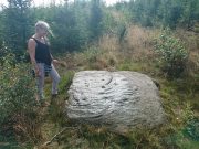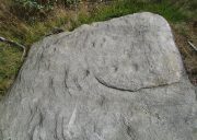 In 1961 when Stuart Feather rediscovered this carving, the “rock was almost completely covered by a six-inch layer of peat and vegetation.” But, like all good rock art explorers, he slowly and carefully peeled it all back and brought back to light another one of Rivock’s olde stories. We know not what the story on the rock might tell, but it looks good nonetheless! Feather counted “several cups carved on it”, but a few more have ben discerned since then. When Boughey & Vickerman (2003) described it in their typically minimalist way, they told it be a “large square rock with surface in slope of hill. About nineteen cups.” Evocative stuff!