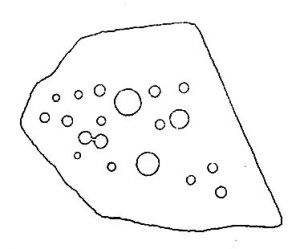 This is only a small stone and takes some finding when the grasses are long. It’s found upon the once archaeologically rich High Plain with at least 17 cup-markings etched onto its surface. A single prehistoric tomb appears to have accompanied the rock and its cup-marks.