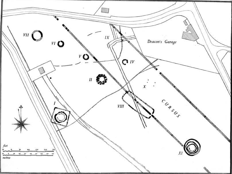 “Both these sites were in existence before the cursus was built. (my italics, Ed.) This is shown by the fact that the southernmost ditch of the cursus cuts through Site VIII and abuts Site XI. These two earlier sites seem to share the same alignment, but once the cursus was constructed it set a new alignment which may have been of significance until the end of the 3rd millenium BC. Three monuments built after the construction of the cursus were located inside it, two of them being along the central axis, and two others were just outside the southernmost ditch of the cursus but shared the same general alignment.