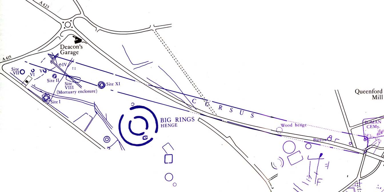 Nowadays marked on modern Ordnance Survey maps as part of a ‘Neolithic Sacred Complex,’ this linear monument was part and parcel of the Dorchester Big Rings henge complex and was associated with a number of other important prehistoric sites, many of which have been destroyed by ecological disfigurement projects in recent years. In Gordon Copley’s (1958) description of the monument, not long after its initial discovery, he said that this “was a cursus which consists of parallel ditches some 4000 feet long with 210 feet between them.” In more recent times Paul Devereux (1989) described how the cursus here,