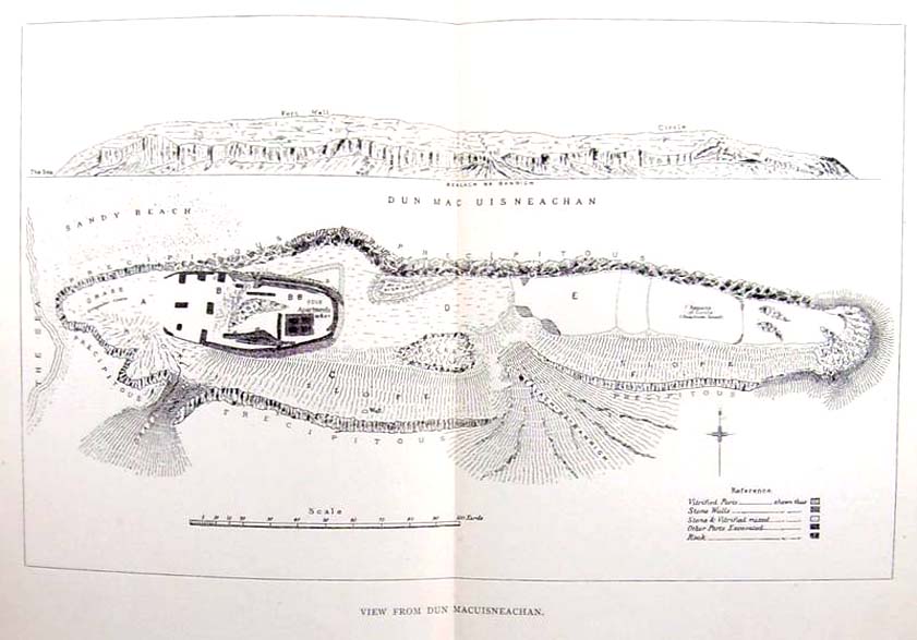 “was superceded by a small subrectangular, now vitrified fort, about 170 feet long by 60 feet wide, and by a circular and probably vitrified dun measuring about 60 feet in diameter.”