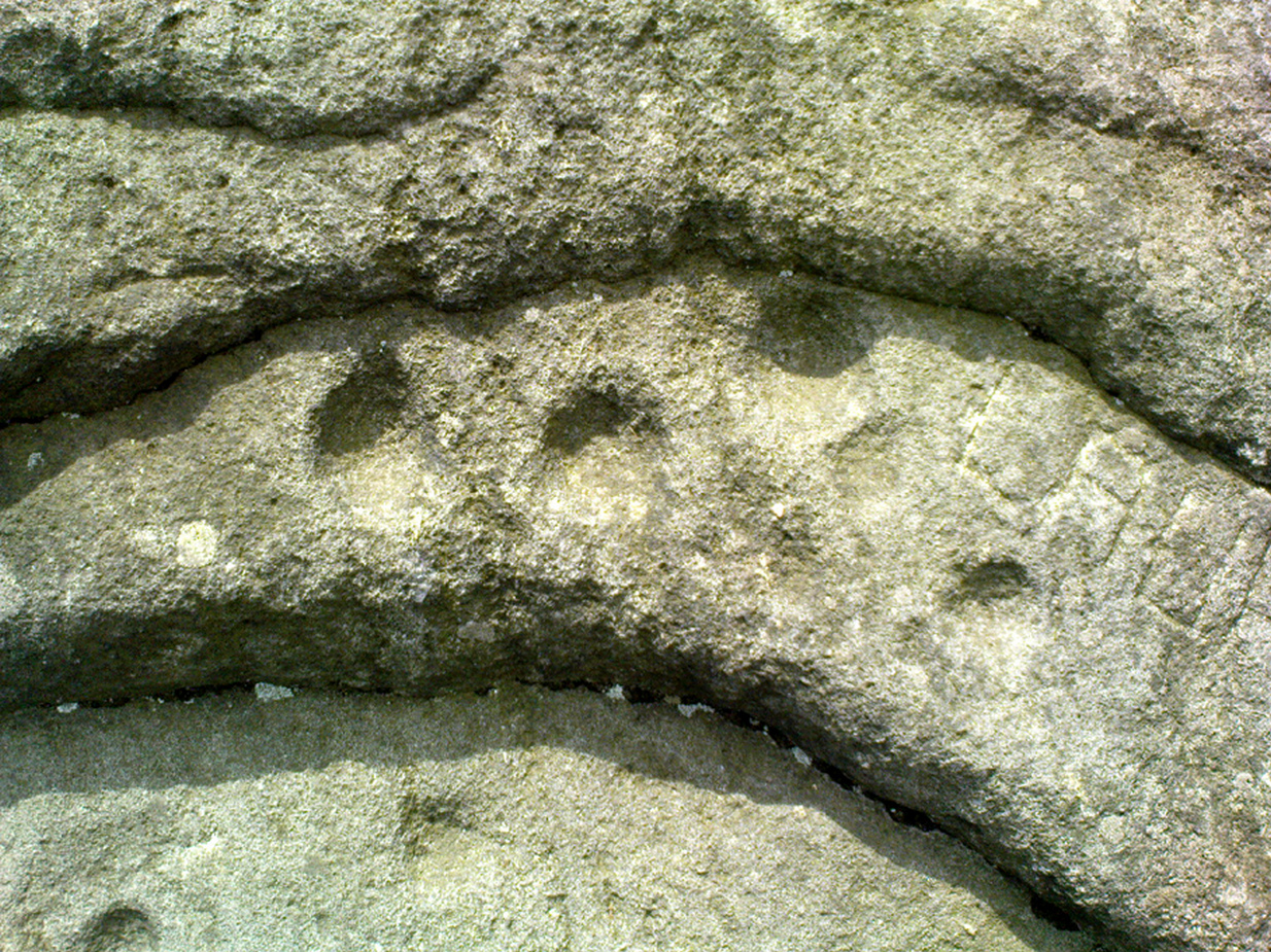 Highlighting this quite firmly, we find that prehistoric walling ‘separates’ this great boulder from the other part of the Plain close to its east and southern sides (walling on its western side is as yet unproven). It was a boulder that was specifically sectioned-off, away from any tombs. All along this Plain are numerous small cairns, many with rock-art nearby, and certain parts of the Plain are split into sections by ancient walling (though a precise map of the walling, tombs and rock-art on this moorland ridge has yet to be done).