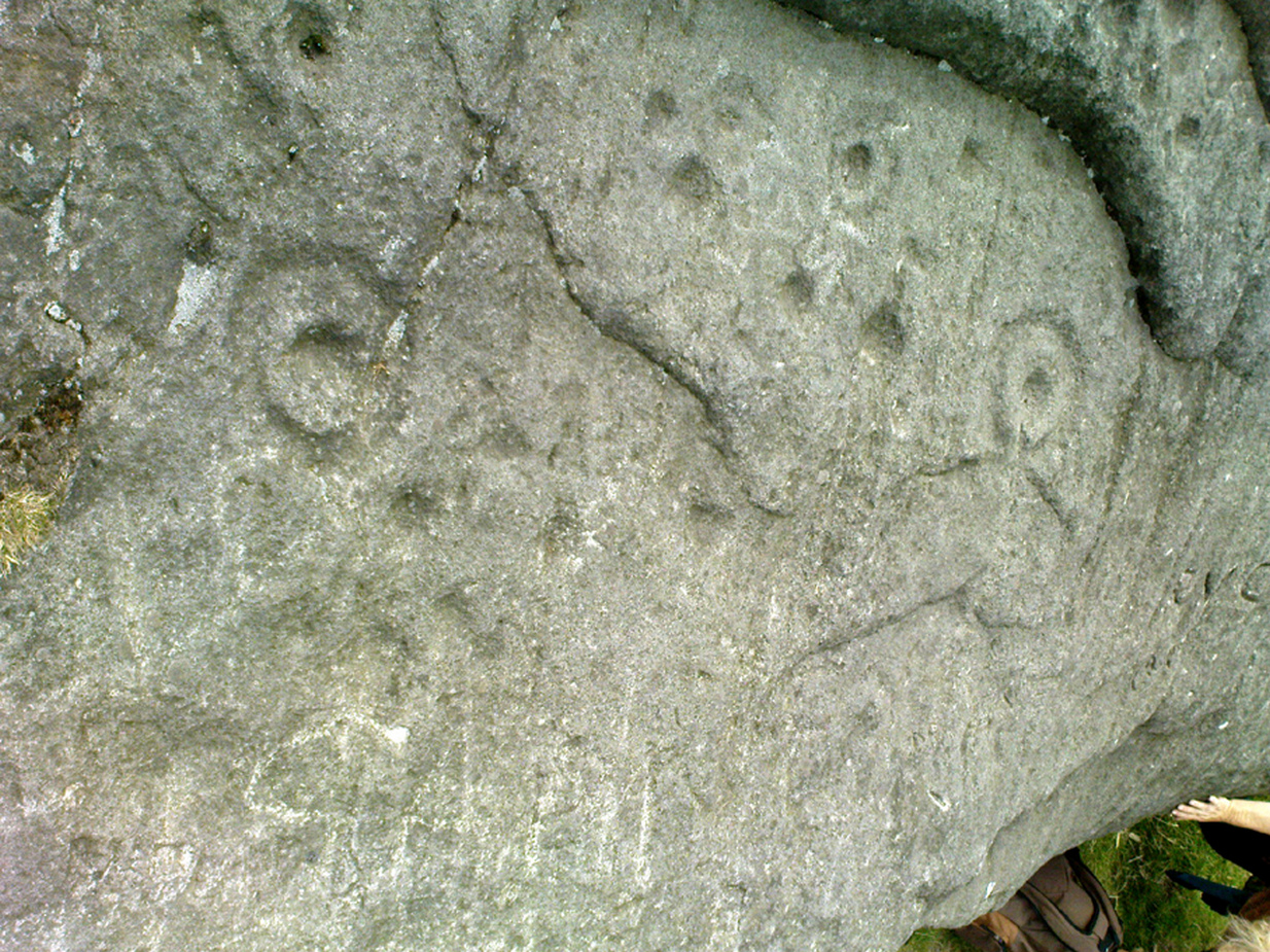 But this is a big and decent carving, with about 60 single cup-markings, 10 cup-and-rings, and various twizzly grooves and lines linking cups to others, and others going to seemingly nowhere. Some of these lines, of course, may be weathering, or weathered channels emerging from once shorter lines. We might never really know for sure what the original carving actually looked like. On the north-facing side is what looks like a decidedly human figurine etched onto this great boulder, in good old cup-and-ring style. I’ve shown this to a few hundred people and they all seem to make the same remark: it’s a woman with her legs wide open — an early form of sheela-na-gig on Ilkley Moor no less! But whether this was intentional (many folk think so), or just us seeing something we want to see (men in particular!), we might never know.