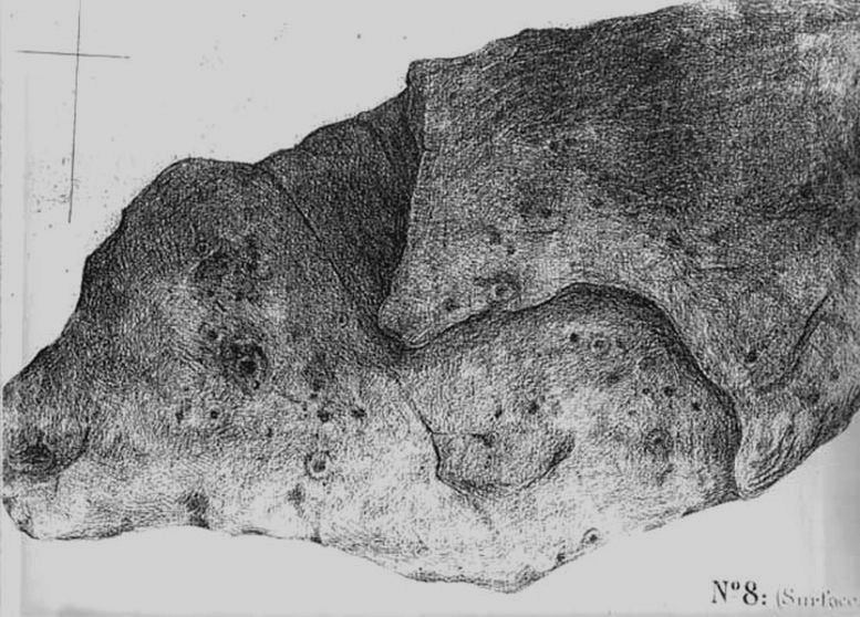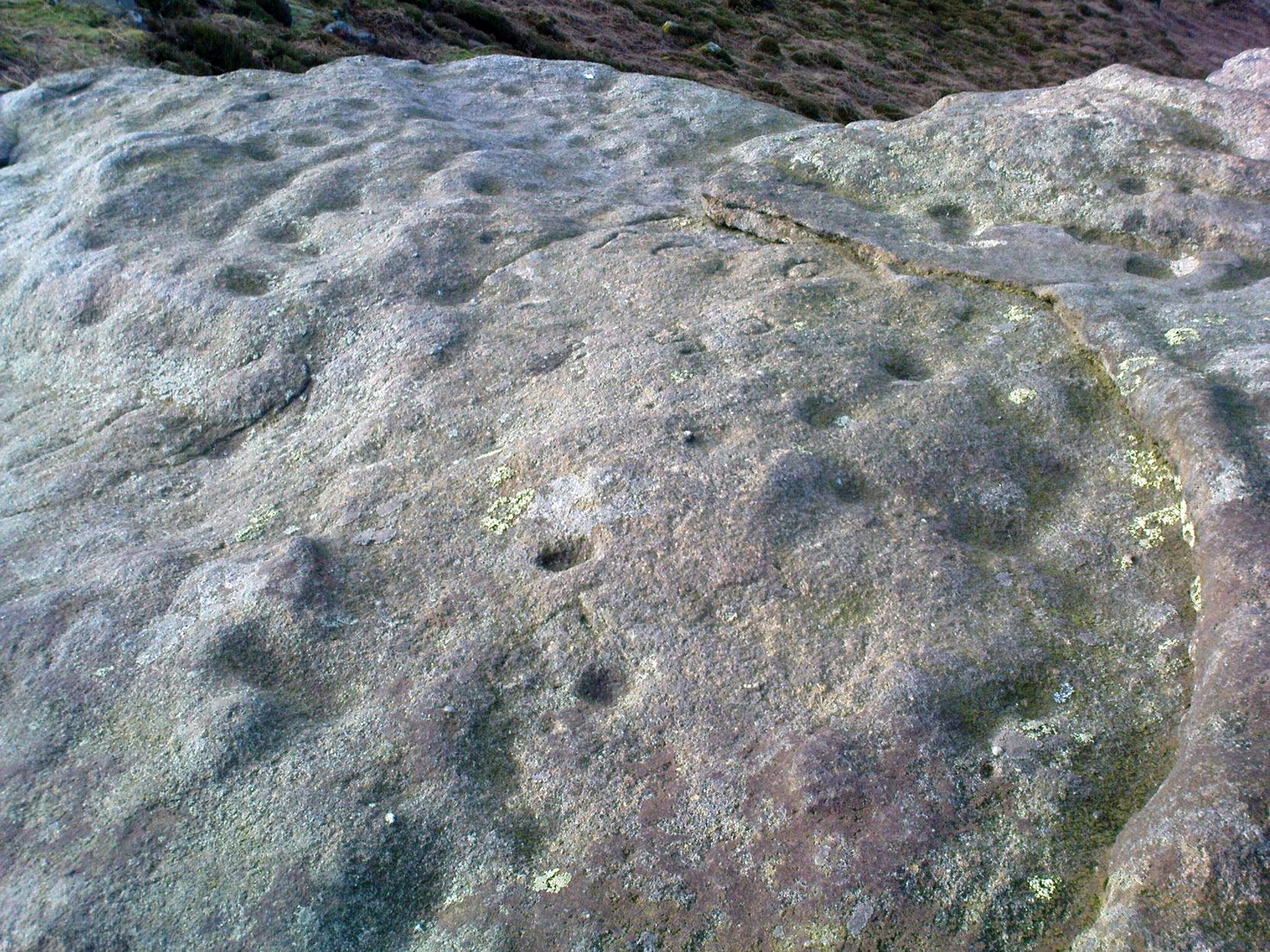 “On its upper surface are several cup-markings much obliterated by the actions of the weather, but some of them sufficiently distinct to prove their origin artificial, and to show that this rock was noticed in ancient times, and very possibly considered an object either of worship or superstition.”