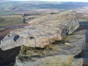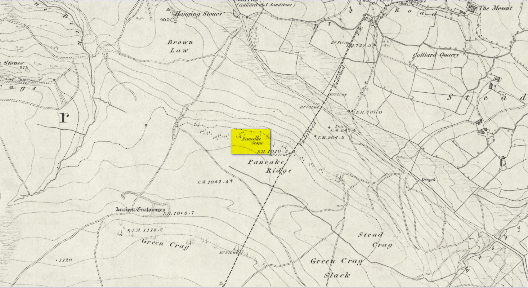 Highlighted on the first Ordnance Survey map of the region in 1851, this prehistoric carved stone had been known as the Pancake Stone by local people long before any antiquarians gave it their literary attention to the place. It would have had tales told of it, no doubt, but they were never written down. It’s an impressive, some would say precarious piece of rock: an elongated thin wedge of stone resting gently on the cliff edge, much like a rocking stone to be honest, seemingly hanging onto the edge of the geological ridge awaiting its fall down the slope; but that’s not gonna happen for many more centuries yet.