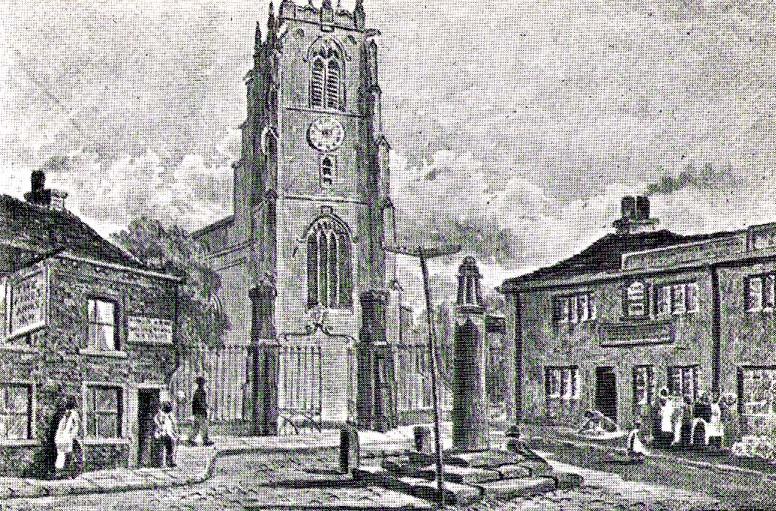 For a relatively trivial archaeological site, it’s got a bittova history. Not that this is an old site either! We’re not sure just when this cross was made, but it’s certainly no more than 300 years old. Before standing in its present position outside St. Andrew’s Church, sometime before 1840 it was said to have been a few hundred yards away above the present roundabout on Oakworth Road; and one record tells that it originally came from nearby Utley, a mile to the north. Due to lack of decent records, we’re not sure about its early status as a market cross, nor when it was first erected. Indeed, even the steps on which the cross presently stands are clearly more recent than the ones illustrated on Edwin Riby’s 1847 portrait, reproduced here.
