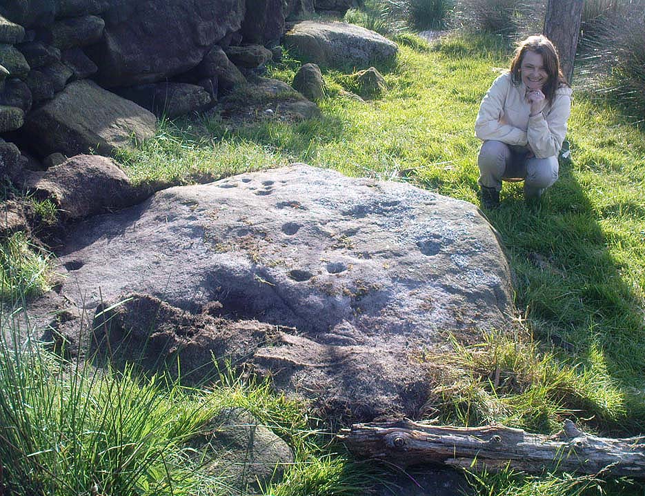 A newly-discovered cup-marked stone, located for the first time on Tuesday, June 9, 2009, by Michala Potts, who was out on an amble with some long-haired halfwit whizzing about getting excited about stupid cup-markings on stones, dragging her back and forth and leaving her in the middle of a bog! On one occasion when this ‘ere fruitbat wandered off (again!), leaving her alone in the middle of the hills, she decided to check out some rocks a bit further up the slope where she’d been left alone. And there, along the edge of some walling, right on the edge of the much-denuded Robin Hood’s Wood, a short distance west of Rivock, a curious stone popped out and caught her attention!