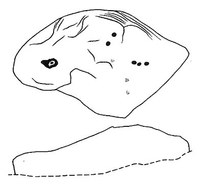 John Hedges and the Ilkley Archaeology bunch had cited it as ‘cup-and-ring’ in their fine work — the first time this old carving had been in print since it was first etched! A few years later when Messrs Boughey & Vickerman (2003) checked it for their survey, no new features had been noted and they just copied Hedge’s earlier notes. Indeed, it’s just a large boulder with a few archetypal cupmarks on it when it first greets the eyes. Nowt special—and with no companions either.