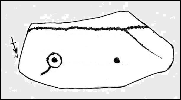 Thought to be another carving first located by Stuart Feather in 1978, though we can’t bne totally sure on that. Curiously omitted from Hedge’s (1986) survey, this old glyph comprises of a single cup-mark near the western end of the stone and a complete cup-and-ring at the eastern-end. It was first illustrated in Boughey & Vickerman’s (2003) fine survey, but they missed seeing a quite distinct line or ‘tail’ coming out the northern side of the cup-and-ring. Nowt special in archaeological terms, but of obvious relevance to the dood who carved it! They thought there may have been two faint cups in the ring, but it isn’t clear by any means.
