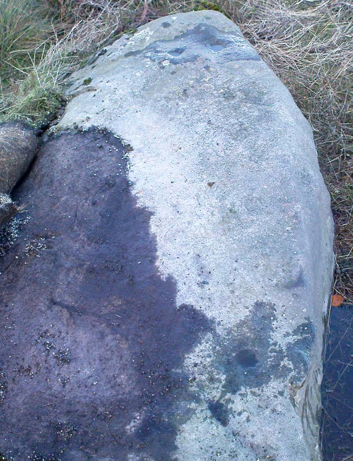A quite large, smooth earthfast rock, but nowt much to look at unless you’re one of the crazy bunch! This is just another one of our basic cup-marked rocks with very little modern archaeo-history attached. There are perhaps as many as four cup-markings etched onto the stone: two at the northern end, one a little further down (not mentioned in Boughey & Vickerman’s survey) and another one cited towards the south end of the stone. Gotta be honest though: a couple of them are slightly dubious and may be natural — but hopefully not! (soz about the crap photo of this poor carving; but the light was shit & our camera packed-up!)