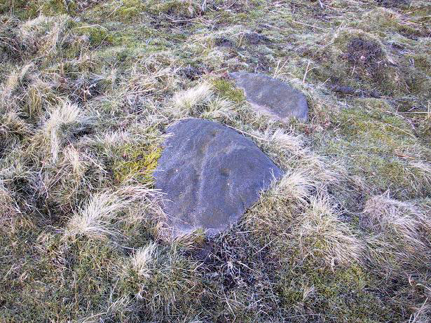 Yet another small carving found amidst a decent cluster of cup-and-rings and other archaeological remains near the top of Dryas Dike, this stone was first described in the Boughey & Vickerman (2003) survey. It’s located about 10 yards below Middleton Moor CR-440, above the stream of Dryas Dike. It’s a simple design, comprising of a central groove with a cup at either end and several other cups either side of this central line. (cheers to Richard Stroud for use of his photo).