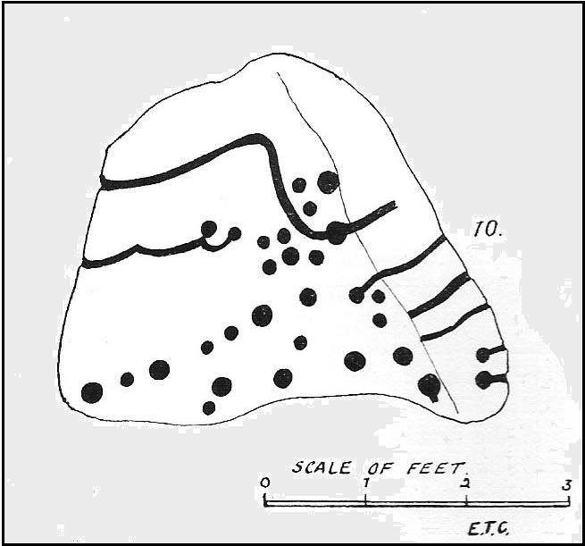 “On the rise above No.9, is a cope-shaped boulder which is almost covered with cup markings and winding grooves. One broad groove winds from the ridge, rising from a cup, and is continued to the margin. Two cups are linked by a curve which is continued to the same edge. The eastern side of the stone is almost upright and bears two cups with grooves running to ground level.”