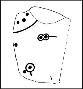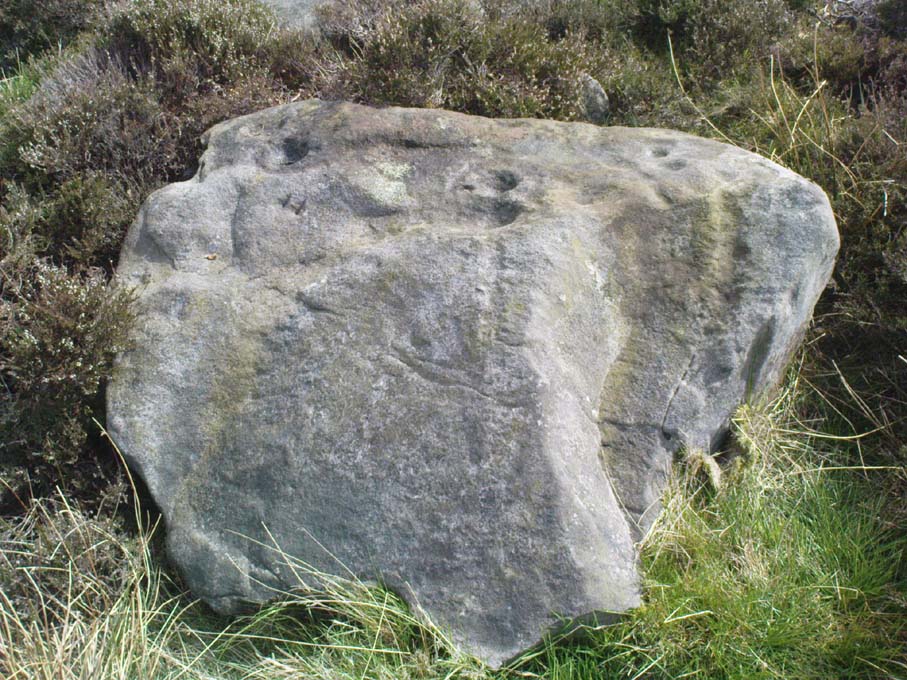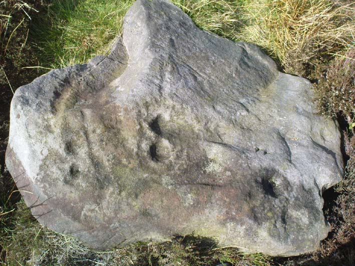 Catalogued as ‘stone 582’ in Boughey & Vickerman’s (2003) survey, their description of the carving was one with “fourteen possible cups, several with indications of a ring, some of which intersect; grooves.”