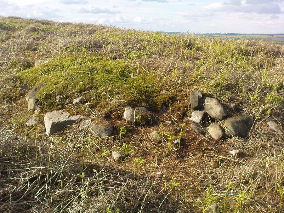 My first exploration here was in the company of Graeme Chappell more than 20 years ago, where we tried locating remains that had been described by Eric Cowling (1946) during a foray taking photographs of the cup-and-ring stones nearby.  But due to an overgrowth of moorland vegetation at the time, the remains which Cowling described proved hard to find.  Years later when Richard Stroud and I visited the place in May 2005, all the heather had been burnt back and much of what looked like the remains of an entire prehistoric village was in plain view for us to see.  I was well impressed!  This occurred again last year, enabling the bunch of us who came here a few times to see even more of the place.  But — just like the newly discovered prehistoric settlement on Blubberhouse Moor a couple of miles north — once the heather grows back again you wouldn’t really think anything of worth was hidden here.   In archaeological terms however — despite the lack of references and research by those who are paid to be archaeologists — we have one helluva little-known prehistoric settlement, complete with walling, hut circles, village hall (!), tombs, cup-and-ring carving and more, much of it probably dating from the Bronze Age, but some of the sites here indicate it was also much in use during the Iron Age period aswell.