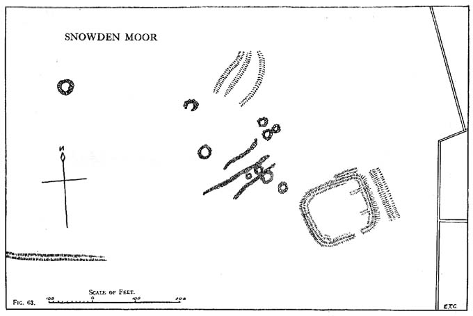 “This concentration of prehistoric features is situated towards the north east edge of Snowden Carr, and measures c.426m x c.155m.  The cairns occur throughout the area and range in size from an elongated cairn 17m x 7m down to cairns c.4m in diameter. The cairns are best preserved in the north western part of the area. The large sub-rectangular enclosure has an earth and stone bank c.3m wide and c.0.6m high. The bank is double on the east side of the enclosure.  The two smaller enclosures have rubble banks 1m-2m wide and up to c.0.6m high.  They are more irregular in shape than the large enclosure.  The boulder walling consists of a number of approximately linear rubble banks 1m-2m wide. It is concentrated in the area immediately north west of the large enclosure, and in the area to its south. The boulder walls are interpreted as part of a field system contemporary with the large enclosure.  The hollow way is located within the southern group of boulder walls and may be contemporary with them. “