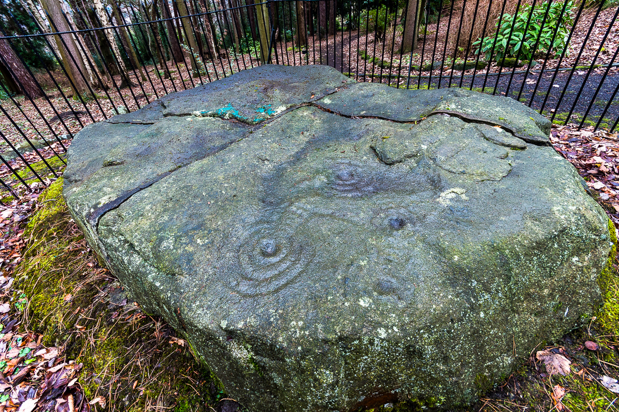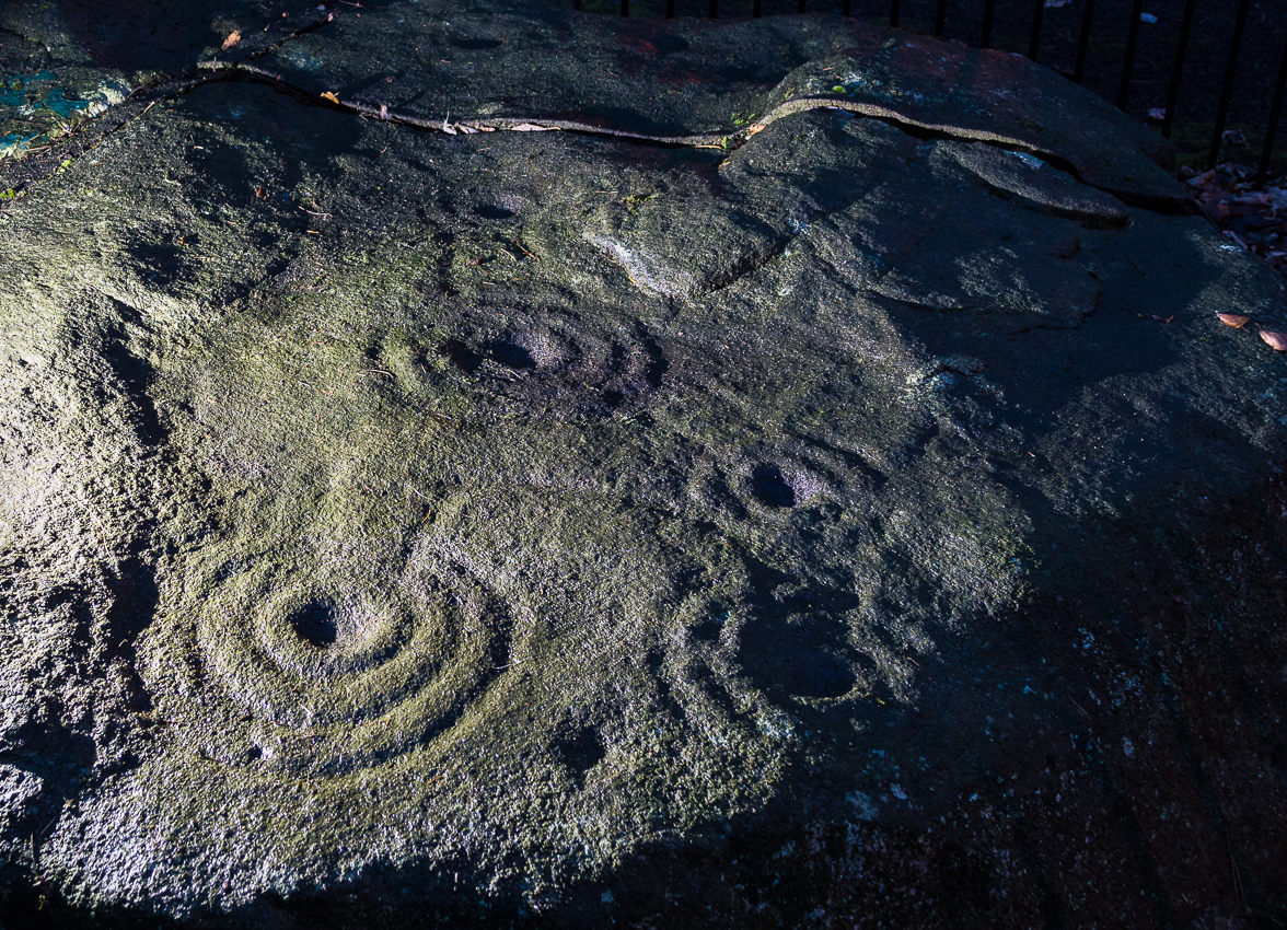 There were originally ten or eleven carvings that made up what have been called the Panorama Stones and the position they are presently housed in this awful fenced section wasn’t their original home. They used to live a half-mile further up from here, on the moorland edge, just in the woodland at the back of the small Intake Reservoir in the appropriately named Panorama Woods. But in 1890, one Dr. Little — medical officer at Ben Rhydding Hydro — bought the stones for £10 from the owner of the land at Panorama Rocks, as the area in which the stones lived was due to be vandalized and destroyed. Thankfully the said Dr Little was thoughtful and as a result of his payment he had some of the stones saved and moved into the position where they live today. However, as a result of the stones being transported closer to Ilkley, the largest of the carvings was damaged and broken in two pieces on its journey, but the good doctor and his mates restored the rock as best they could before sitting it down in the caged position where it remains to this day.