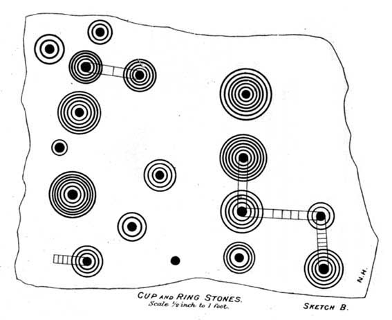 “Near the Panorama Rock are three large masses of ironstone close together, and averaging ten to twelve feet across each way, the horizontal surface of which are covered with cups and rings, and two of these stones have also a peculiar arrangement of grooves somewhat resembling a ladder in form.”