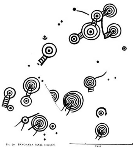“The Panorama Rock lies one mile south-west of Ilkley, and from a height of 800ft above the sea commands a magnificent view over Wharfedale and the surrounding country. About 100 yards to the west of this spot appears to be a kind of rough inclosure, formed of low walls of loose stones, and within it are three of the finest sculptured stones near Ilkley. They lie almost in a straight line east and west, the first stone being 5ft from the second, and the second 100ft from the third. The turf was stripped from the first a few years ago, and its having been covered up so long probably accounts for the sculpture being in such good preservation. It measures 10ft by 7ft, and is im- bedded so deeply in the ground that its upper horizontal surface scarcely rises above the level of the surrounding heath. The sculpture consists of twenty-five cups, eighteen of which are surrounded with concentric rings, varying from one to five in number. The most remarkable feature in the design is the very curious ladder-shaped arrangement of grooves by which the rings are intersected and joined together. I do not think that this peculiar type of carving occurs anywhere else besides near Ilkley. The second stone is of irregular shape, measuring 15ft by 12ft, and supporting a smaller stone of triangular shape 6ft long by 4ft broad. Both upper and under stone are covered with cups and rings, but the sculptures have suffered much from exposure. The superimposed block has eleven cups, two of which are surrounded by single rings. The under stone has forty-two cups, nine of which have rings. Amongst these are two unusually fine examples, one has an oval cup 5in by 4in, surrounded by two rings, the diameter of the outer ring being 1ft 3in. Another has a circular cup 3in diameter and five concentric rings, the outer ring being 1ft 5in across. The third and most westerly stone of the group measures 10ft by 9ft, and lies almost horizontally, having its face slightly inclined. On it are carved twenty-seven cups, fourteen of which have concentric rings round them. Some of the cups have connecting grooves and three have the ladder-shaped pattern before referred to. Several stones near have cup marks without rings.”