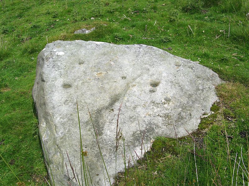It is a flat, roughly triangular stone described by rock art students Boughey & Vickerman (2003) and having 13 cup-markings on it. To get a full look at the entire carving, you may have to roll a bit of the turf away from one side of the rock.