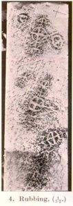 “Examination of the rough and sloping rock surface revealed an interesting group of inscribed figures, confined to an area of about 8 by 2½ feet, four of which included a cross within a circle. The figures are difficult to discern, except when thrown into relief by early morning sunlight, but are clearly demonstrated on a rubbing.