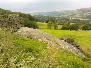 From Pateley Bridge take the B6265 road towards Grassington, turning left just a coupla hundred yards over the river bridge, towards Bewerley. Go through the hamlet and take the second on the right, up the steep zigzagging lane. A half-mile up the hill, watch out for the track onto Westcliff Farm. Go along here and onto the footpath, then as you walk through the field, look uphill where the long wall runs into the trees, and you’ll see a rock in the walling near the top. That’s it!