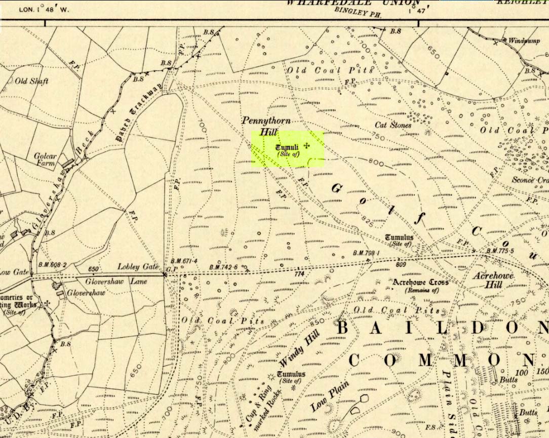 Highlighted on the 1909 OS-map of the area, on the top of the hill a short distance from the roadside, about 250 yards northwest of the Acrehowe Hill site (now at the edge of the golf course) could once be seen another prehistoric burial mound. The rediscovery of this tumulus was first announced briefly in the January 1905 edition of the Bradford Scientific Journal (issue no.3). A few months later the local writer and historian William Preston (1905) wrote a more detailed article on the site, telling the following information: