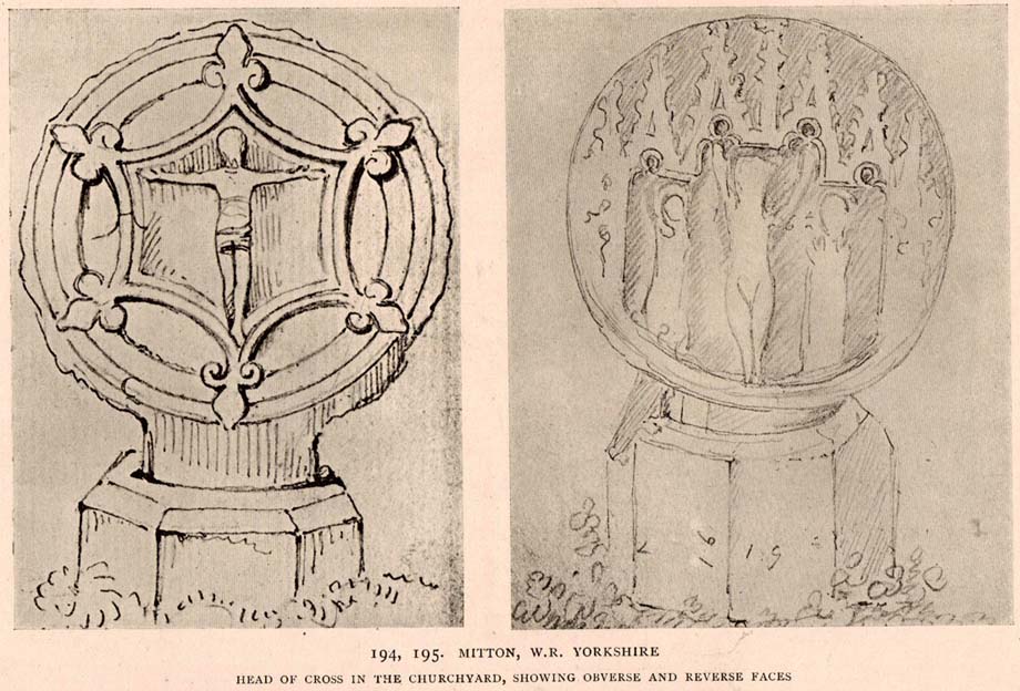“the cross-head at Mitton, Yorkshire…is peculiar inasmuch as the crucifixion is sculptured on both faces, but in totally different fashions. That on the west face has the arms stretched horizontally, within a sexfoil frame, and might well be of the thirteenth century. Whereas the sculpture on the east face, though much more weatherworn, is of a style that could not have been designed before the fourteenth, or perhaps even the fifteenth century. The arms of the Christ in this instance are drawn upwards in an unusually oblique direction. It is impossible that these two representations could have been executed at one and the same date. The circular outline of the head, too, is peculiar, and suggestive rather of a gable-cross than of a standing cross. Possibly the west face only was sculptured in the first instance, for a gable-cross, the sculpture on the east face being added later in order to adapt the stone for the head of a churchyard cross.”