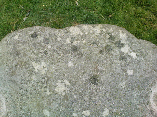 “Very large, uneven, rough grit rock with face with scooped-out areas sloping down to grass. Eleven possible cups and six basins.”