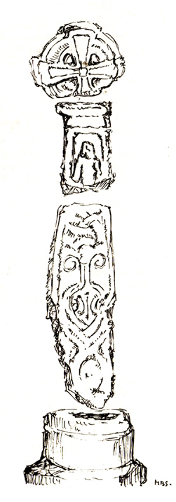 “d) the neck of a cross. Calverley notes that the execution of the wheel-head and the shaft-fragments was by a hacking not a chiselling method, and he makes the comment: “The shafts and head at Burton are similar in workmanship to those at Halton. The Halton crosses and not Norse in style, but are like late pre-Norman work in Yorkshire, where the Danes lived.”