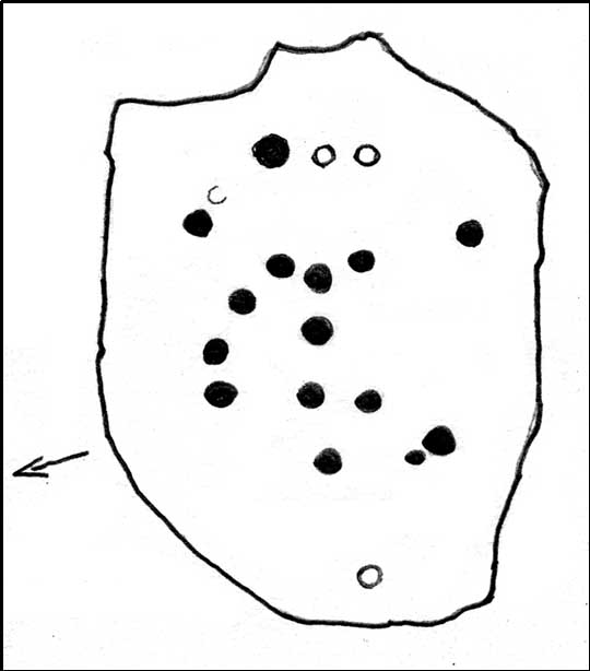 Rediscovered on Tuesday March 6, 2012, this medium-sized rounded (female) rock has somehow evaded all previous archaeological evaluations. It is one of at least five previously unrecorded cup-marked stones found close to each other on the eastern section of Rombald’s Moor near the Little Skirtful of Stones. The rock measures roughly 2 yards by 1½ yards and possesses at least 15 cup-marks that cover most of its surface. Each cup-mark averages about 2 inches across and are less than ½-inch deep. There is a natural ‘bowl’ in the southern section of the rock with a typical cup-mark in it and a smaller one in close association.