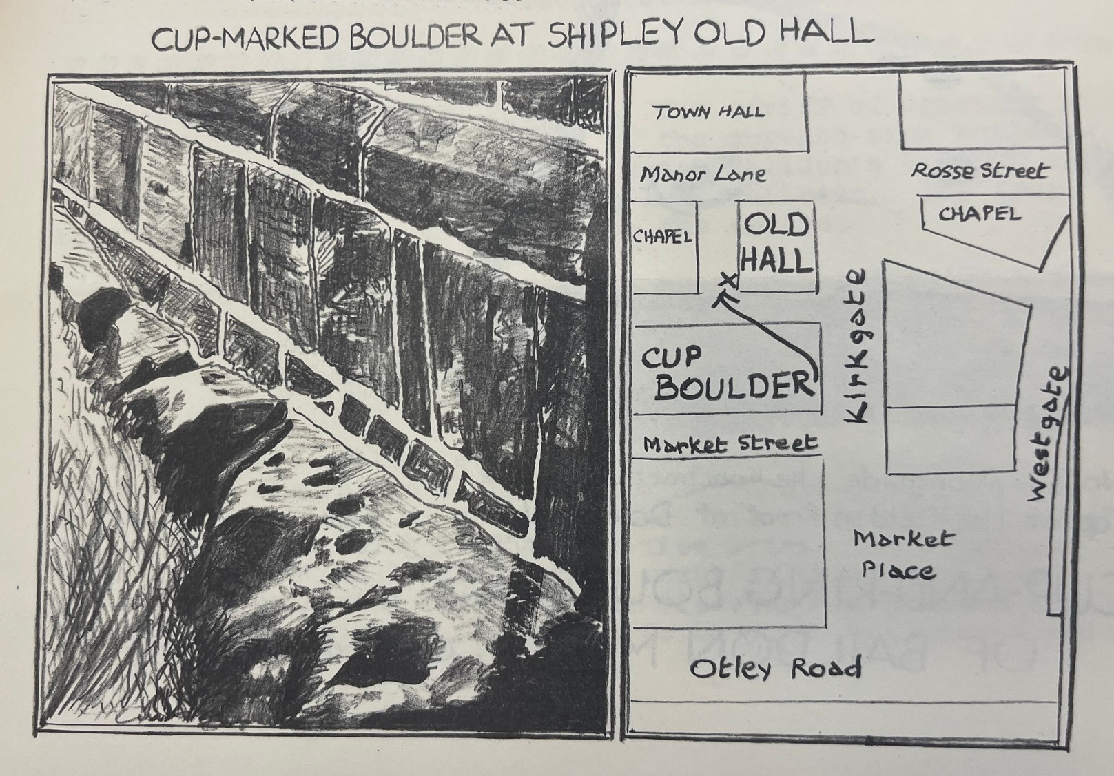- Jackson, Sydney, “Cup-Marked Boulder, Shipley Old Hall,” in Bradford Cartwright Hall Archaeology Group Bulletin, 1:10, 1955.