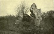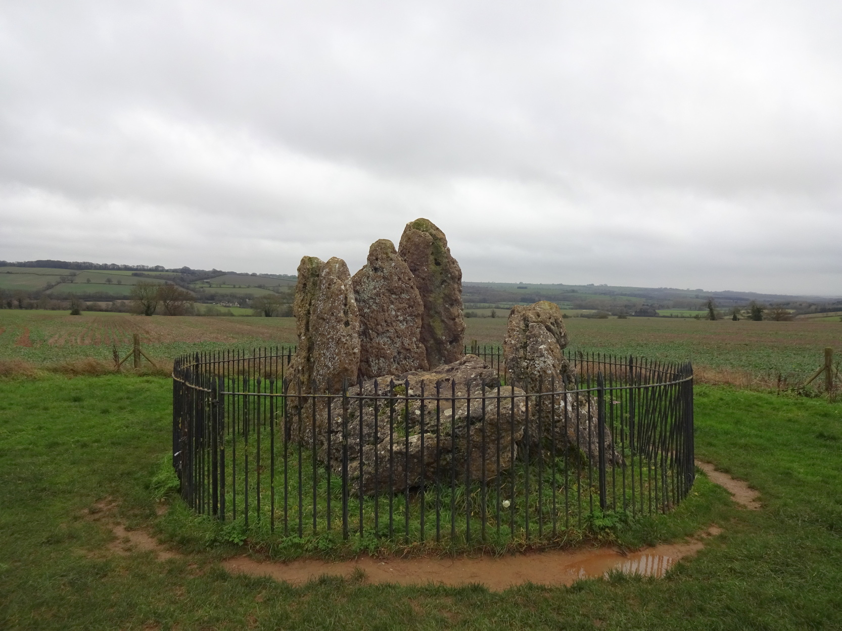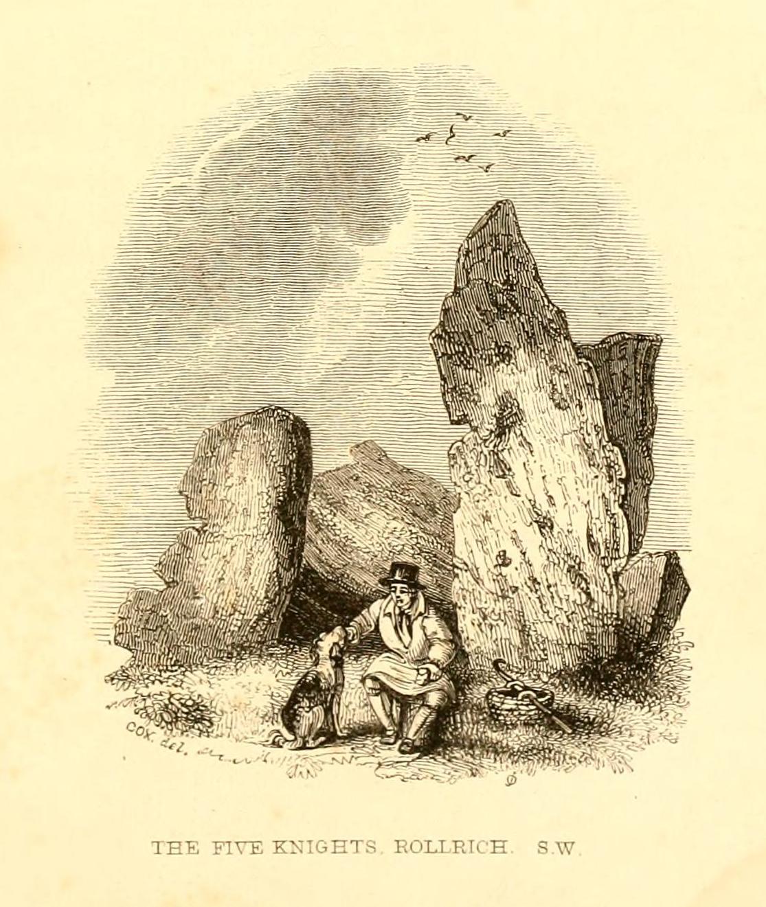 “About 356 yards E from the (Rollright) circle and S of the road, is the dolmen about to be described, called the Five Whispering Knights. It is in a ruinous state. It now consists of four stones, upright, or nearly so, and one prostrate, all of coarse limestone…