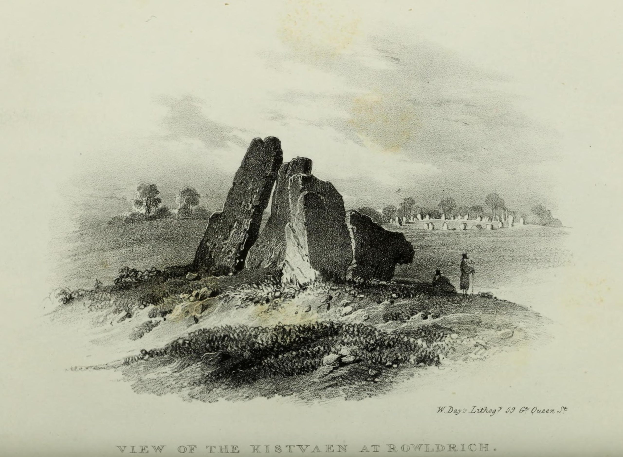 “Tis composed of six stones, one broader for the back part, two and two narrower for the sides, set square to the former; and above all, as a cover, a still larger. The opening is full west to the temple or Rowldrich. It stands on a round tumulus, and has a fine prospect southwestward down the valley, where the head of the Evenlode runs.”