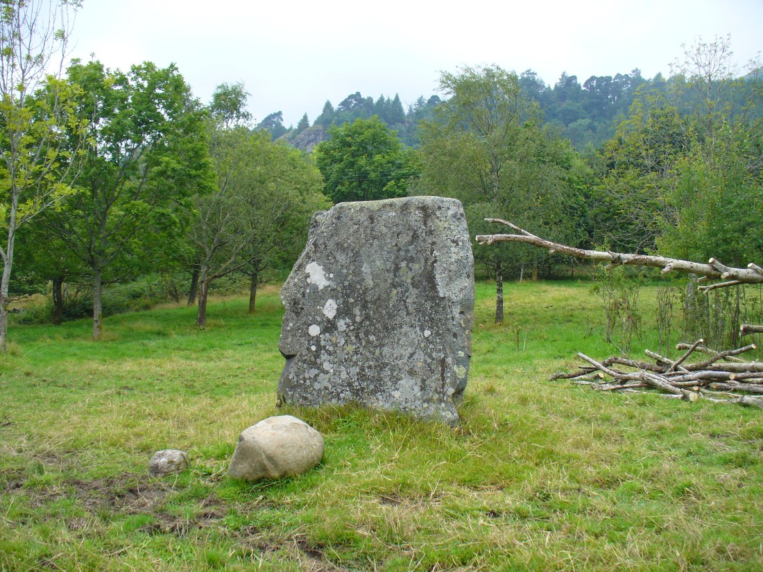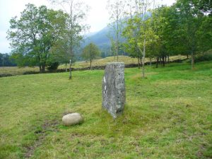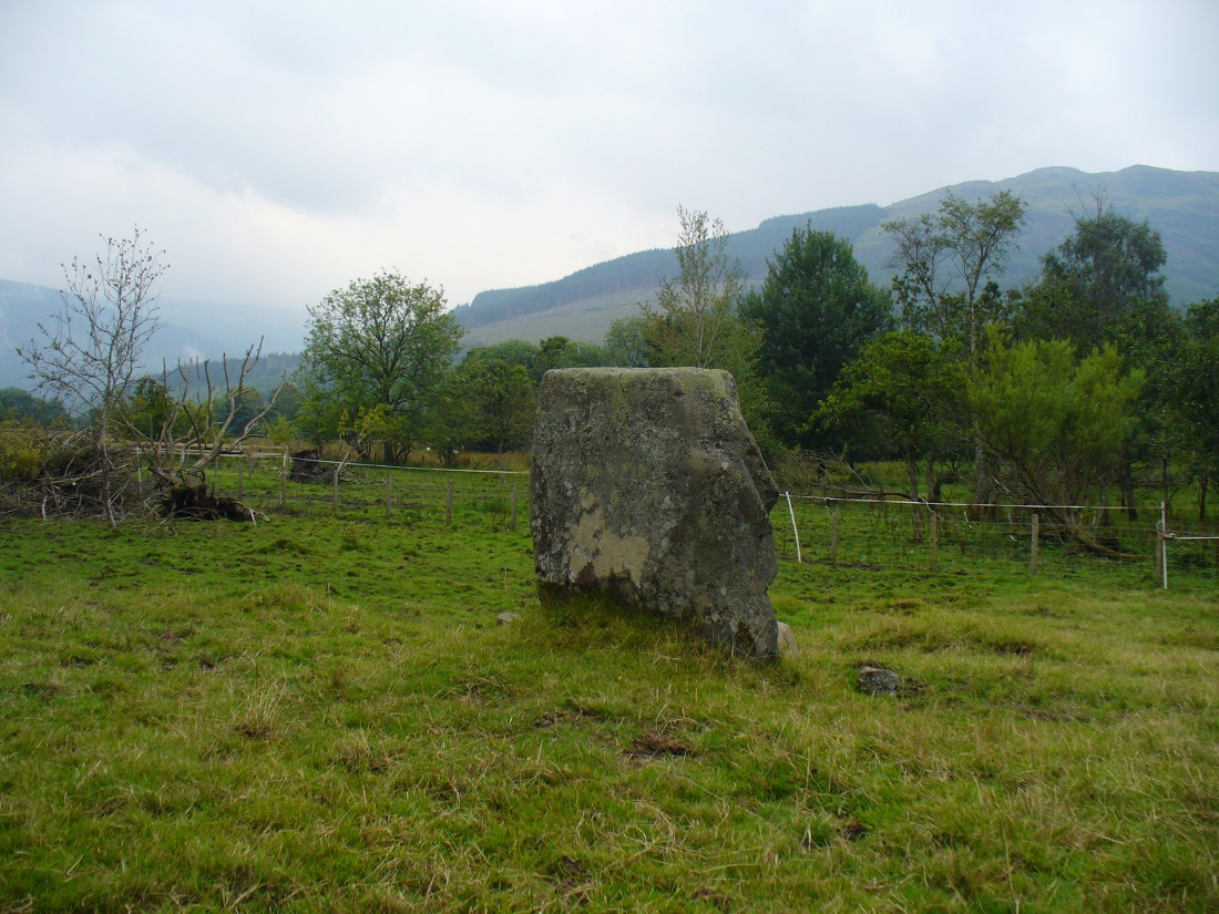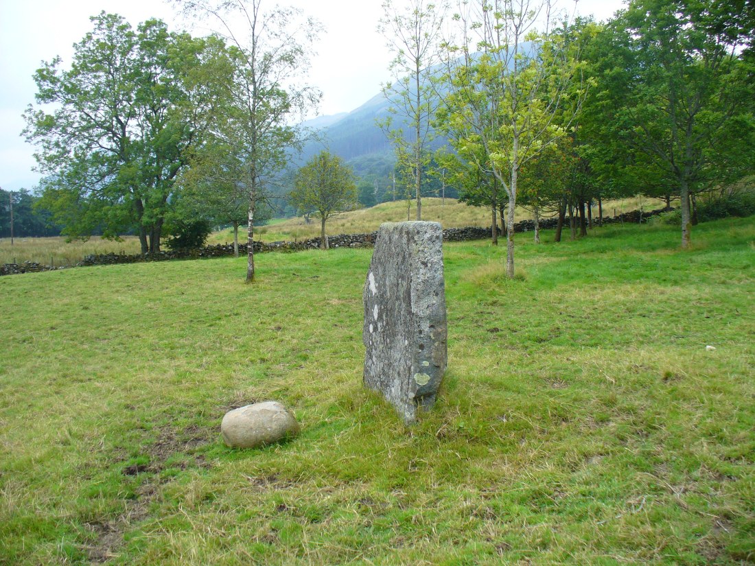 “On the level ground below (Tom na Croich) …there is a prominent monolith, standing about 4½ feet above ground, quite flat, on the top. It is shaped like a wedge, with the edge to the east, and is famous in Balquhidder as the place where trials of strength took place.”