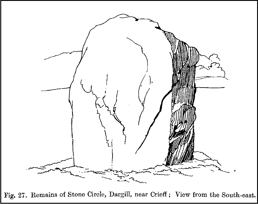 “This place-name deserves brief notice. It is pronounced by persons in the locality as if it were spelt like the Irish name Dargle, having the stress on the first syllable. The site is in a field between the main road from Crieff to Auchterarder and Dargill Island on the river Earn, at the height of 121 feet above sea-level… There is here an indistinct mound, not now easily traceable, nor of any considerable height; but it is significant to have to report that up to 1909, when a new tenant entered the farm, two other great Stones were standing. These were removed by the newcomer, much to the surprise and indignation (I was told) of the neighbours. The remaining monolith is an unusually square and massive oblong block of schist, girthing over 16 feet, and standing clear of the ground 7 feet 8 inches in height. Its eastern edge is rough and riven into long vertical hollows; but the other sides are, on the whole, smooth. I append a view from the south-east.”