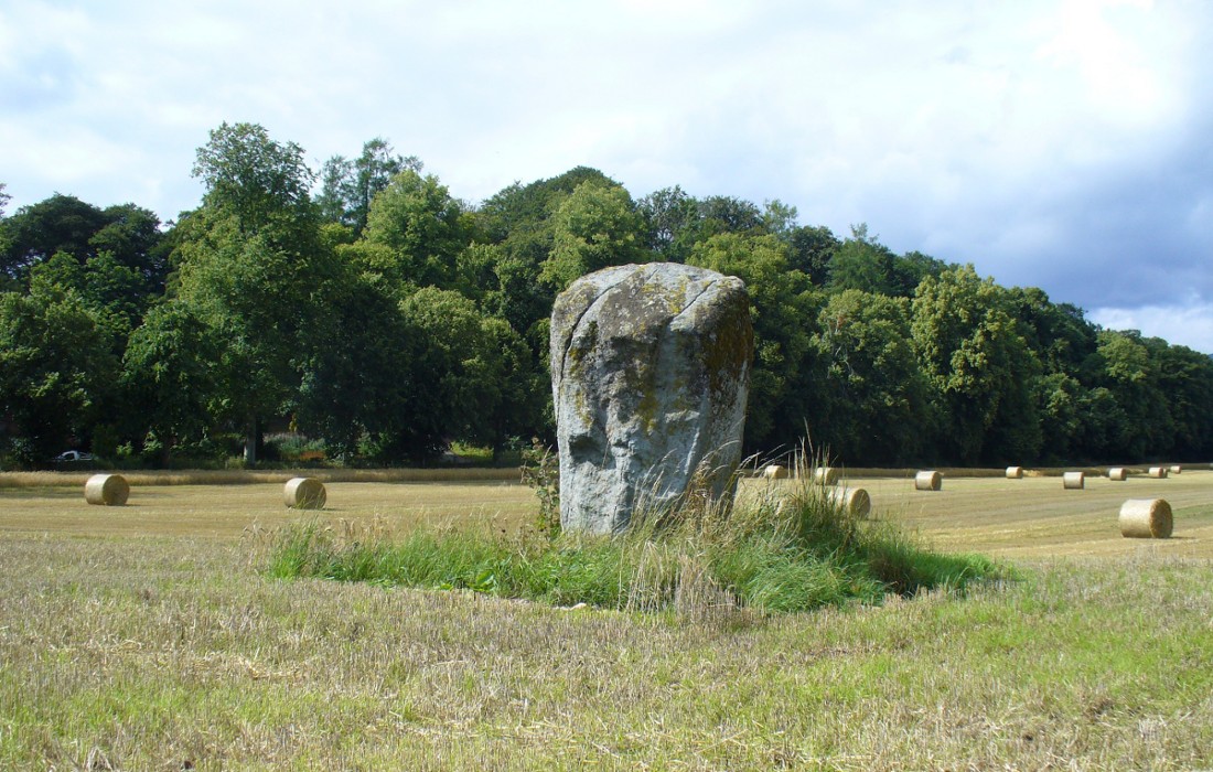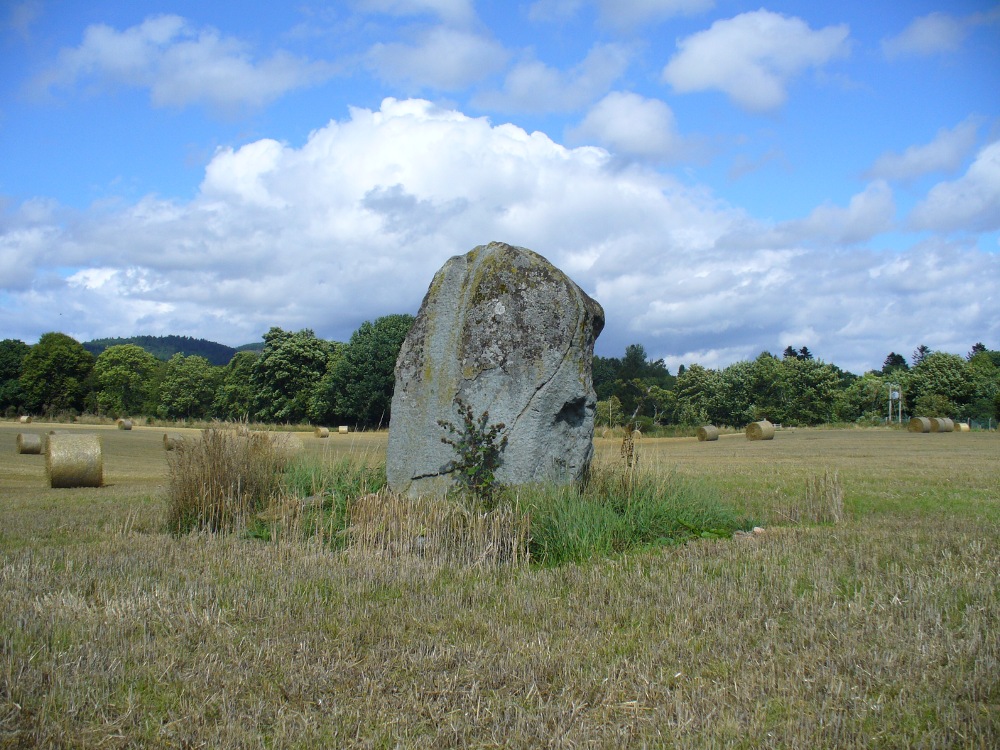 As you approach or leave Crieff along the A822 you can easily pass this stone by. Which would be a pity, as it’s quite a giant standing alone just above the slight ridge in the field. And in times gone by, not only were there other standing stones here as companions, but a cluster of other prehistoric pits, enclosures and linear markings were all around this very spot. Some of them are visible as faint crop-marks even today, but they remain unexcavated and we are left (presently) in the dark as to their nature.