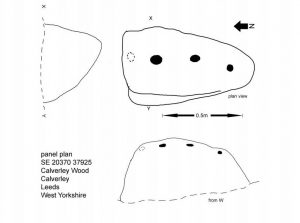 The profile (and ‘How to Get There’) for this recently discovered cup-marked stone was forwarded to me by fellow rock art explorer, Mike Short.  The carving is another basic design found in Calverley Woods, between Leeds and Bradford, nearly halfway between the missing petroglyphs of West Woods 2 and Sidney Jackson’s Calverley Woods Stone.  Rediscovered by Lisa Volichenko some time ago, Mike described the new carving here as follows: