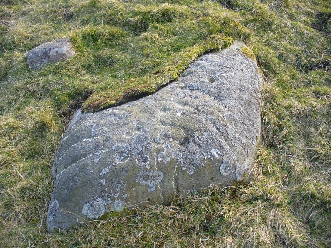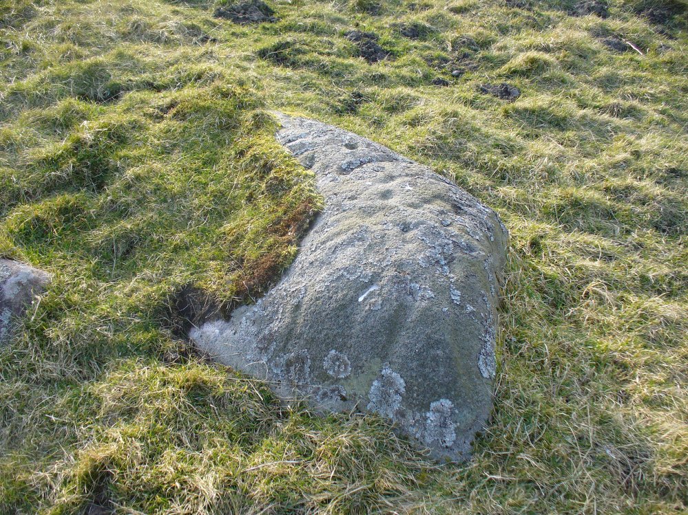 There are at least a dozen cup-markings etched onto the upper surface of this curved stone, with the majority of them clustering around its eastern side. It seems there’s only one cup-marking on the western section of the rock, with the majority of them carved near the middle of the rock and then moving to its eastern section. But the curious features are the interlinking carved lines which you can see have been highlighted on the top and sides of the stone. Initially you get the impression that they’re natural, but it becomes obvious the more you look at them that they’re an integral part of the carving. Some of the lines typically link-up with other cups, whilst a number of them have been carved along and down the vertical faces of the rock, primarily on the east and north-east edges. At least seven of them have been done and they all reach down to ground-level.