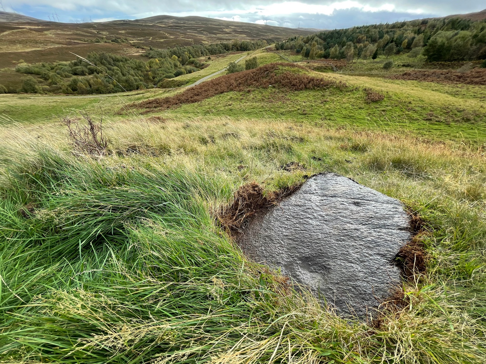 It’s unusual – and I’m still not sure whether it’s natural or not. The carving needs more attention, in better daylight. Or perhaps the computer-tech kids might have a look at it and see if this really is an eye-in-the-triangle style design we’ve got here. It would be damn good! Anyhow, the carving was first mentioned by George Currie (2005), who told of it being two metres south of the Black Burn (2) cup-and-ring and, plainly, that it “has two cups: 60 x 15mm and 25 x 8mm.” It overlooks the urisk-haunted Urlar Burn, a creature known in some places for having milk and other offerings poured into cup-marks to appease it and gain good fortune.