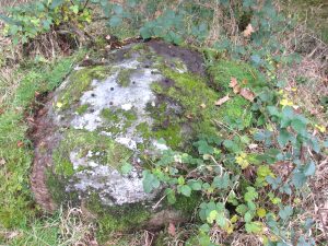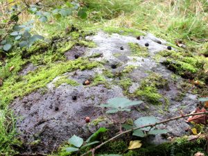 Not recorded on the Canmore online database, the Witches Stone is a low-lying, domed, earthfast rock bearing at least 12 cup marks. One cup mark has been drilled at some time in the past. Did the land owner do this as a preliminary to blowing it up with gunpowder? There is an interesting story relating to the origin of the cup marks, and it seems the name of the rock and its folklore may point to its ritual significance having passed down through oral tradition from the Bronze Age to historical times.