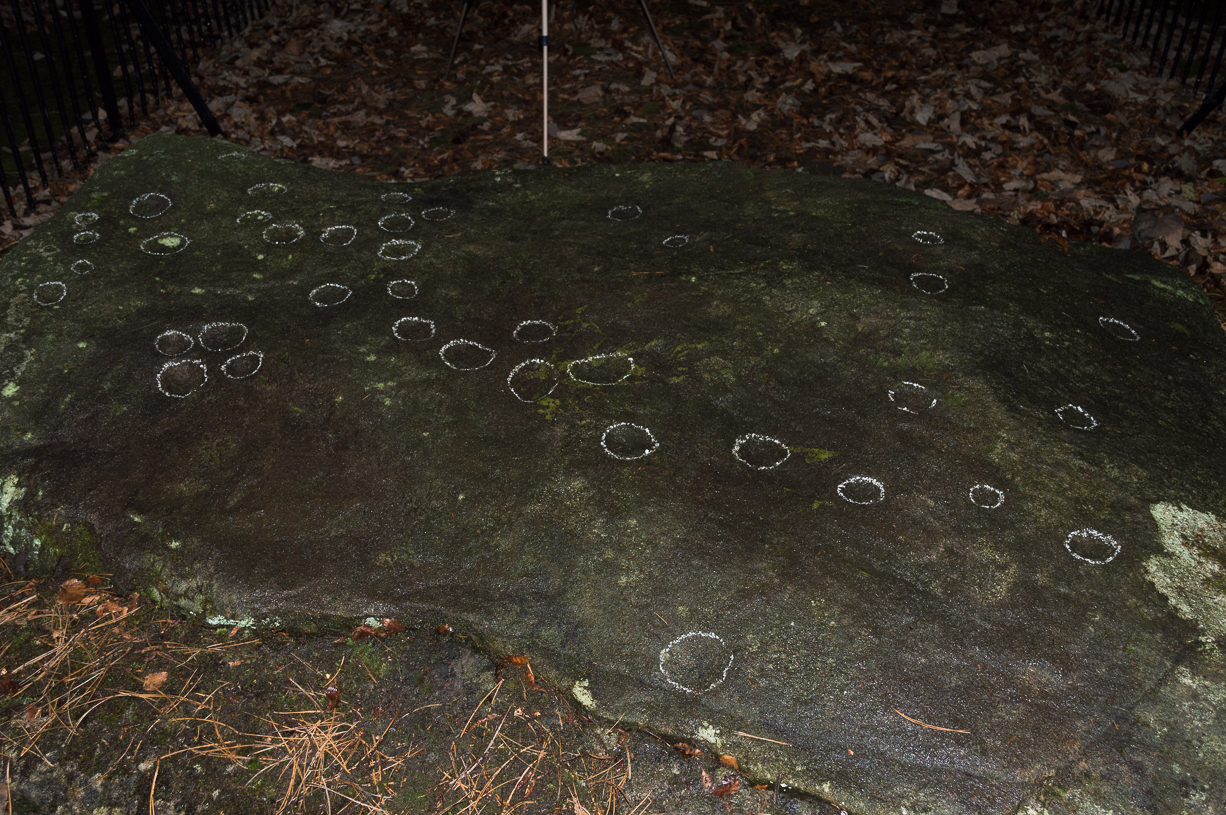 “Large rock, now set in concrete base, the surface rapidly deteriorating. Over forty cups, three with single rings, one showing traces of a second, grooves.”