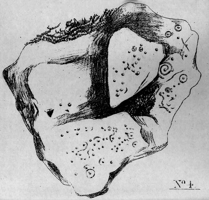 “second stone is of irregular shape, measuring 15ft by 12ft, and supporting a smaller stone of triangular shape 6ft long by 4ft broad. Both upper and under stone are covered with cups and rings, but the sculptures have suffered much from exposure. The superimposed rock has eleven cups, two of which are surrounded by rings. The under stone has 42 cups, nine of which have rings. Amongst these are two unusually fine examples, one has an oval cup 5in by 4in, surrounded by two rings, the diameter of the outer ring being 1ft 3in. Another has a circular cup 3in diameter, and five concentric rings, the outer ring being 1ft 5in across.”
