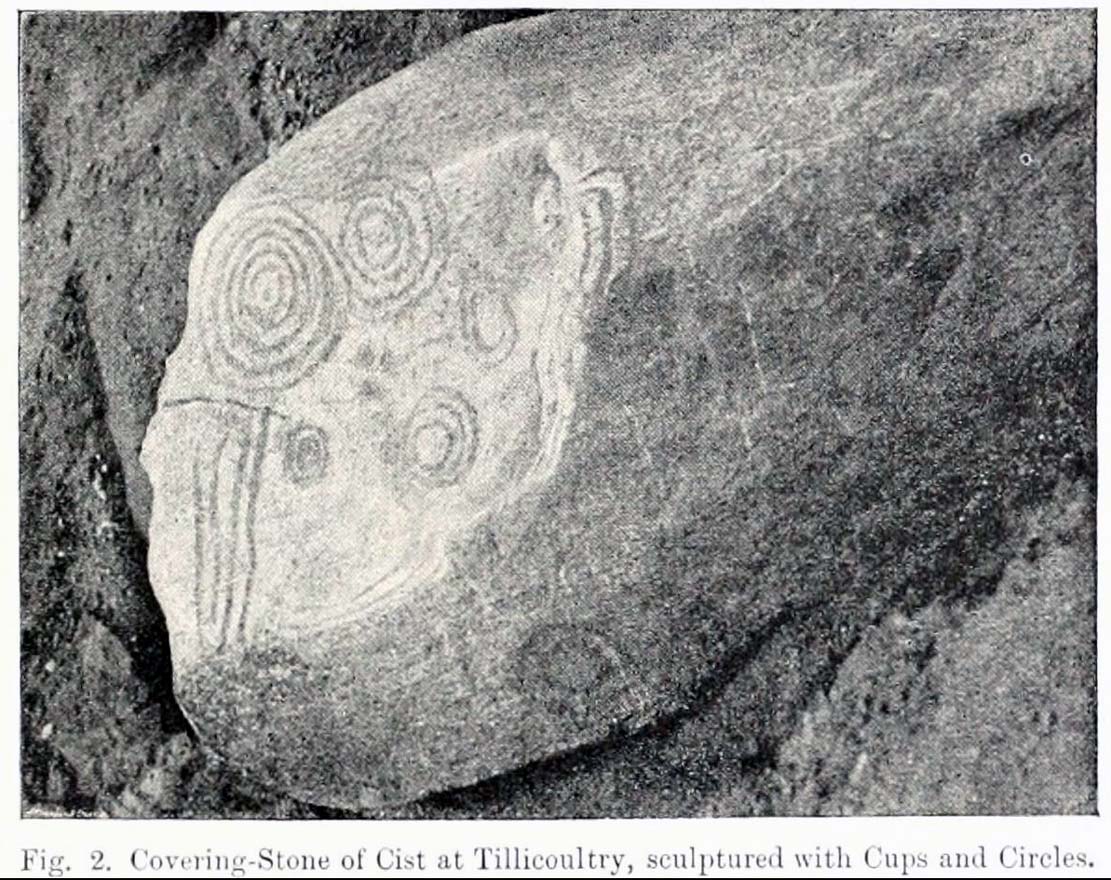 “On clearing this away a remarkable feature was brought to light. The block was found to be elaborately ornamented on its sides and upper surface, with rings, spirals and lines. The labour of cutting these in the hard granite with primitive tools of the period must have been very great. Several successful photos of the stone and its carvings were taken by Provost Westwood, Dollar…. This stone has now been removed to the vicinity of Tillicoultry for safety.”
